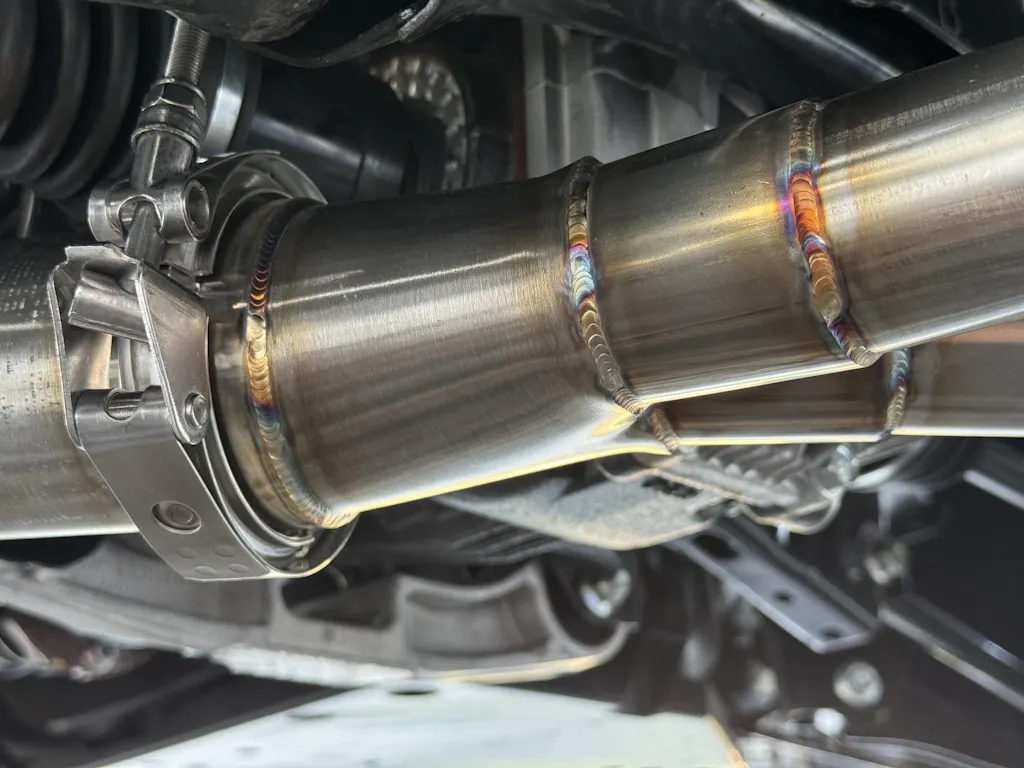 and it gets even better! Our mid pipes also use a v-band connection at the rear of the front section of the mid pipe. This allows you to have adjustability in the clocking of the mid pipe to get the fit perfect during your installation.
